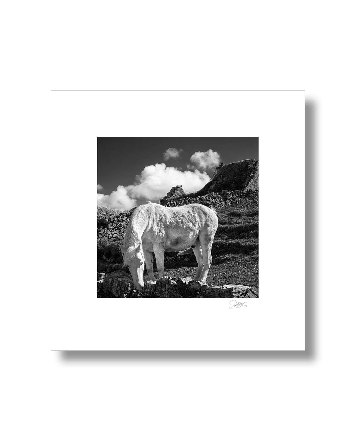 White Horse of Aran is a Fine Art black and white Print by Patrick Donald. Framed Photography of Ireland is delivered to your door from his studio in Kilkenny—an Award-winning Irish photographer who takes pride in his craft.