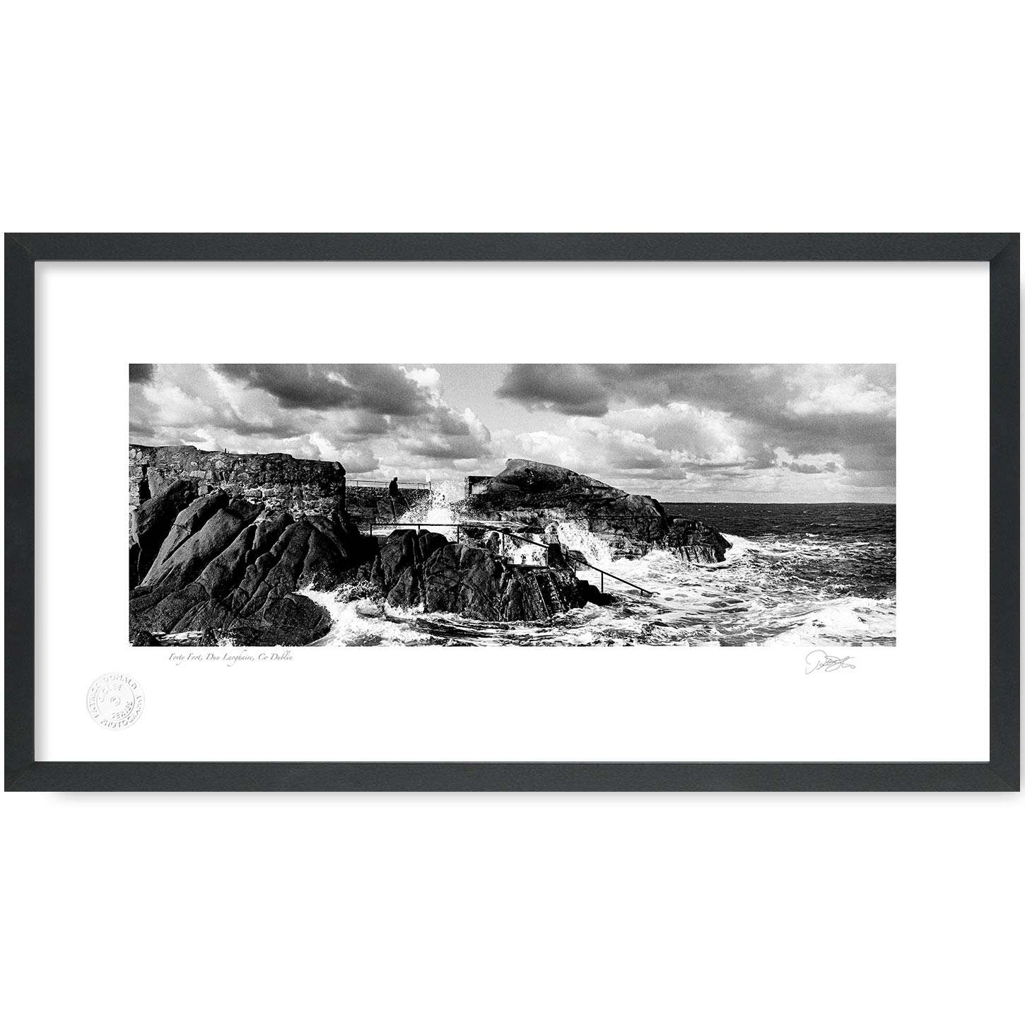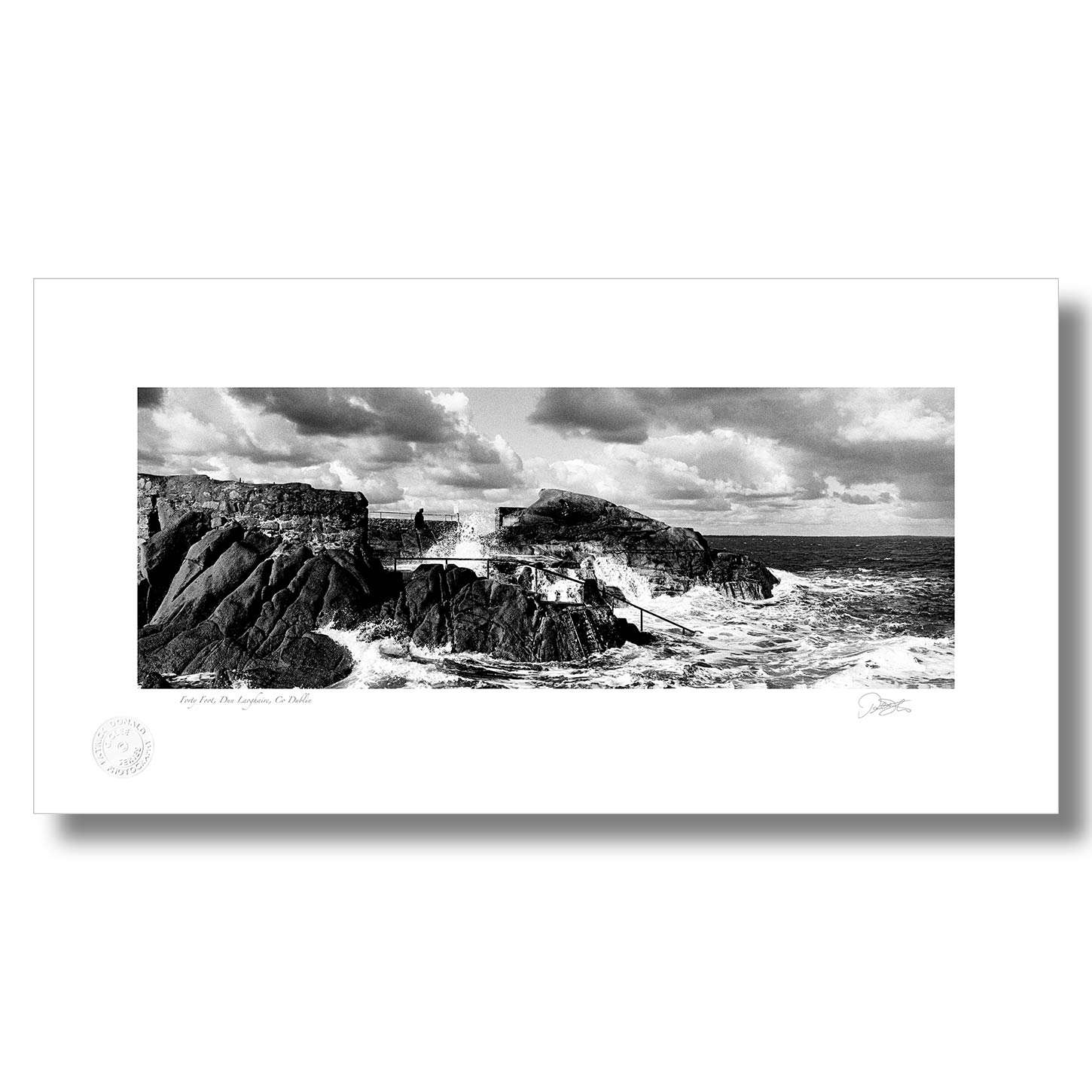 ‘One of Irelands most famous swimming areas set beside Sandycove Dublin the Fortyfoot as it is known, accommodates a steady stream of hardy swimmers right through the winter. This black and white image in panoramic gives an evocative rustic sense of the challenge that many swimmers meet when taking to the water’