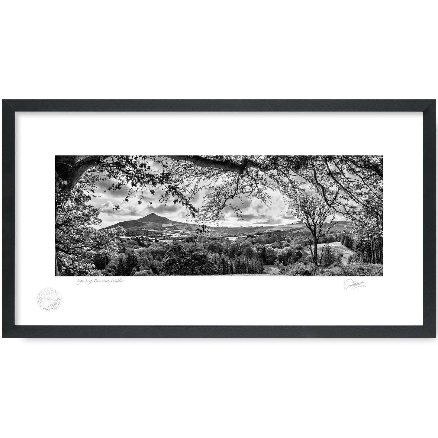 The Sugar Loaf Powerscourt Wicklow is a Fine Art Black and white Open Edition Print by Patrick Donald. Framed Photography of Ireland is Delivered to your door from his studio in Kilkenny, an Award-winning Irish Landscape and documentary photographer who takes pride in his craft.