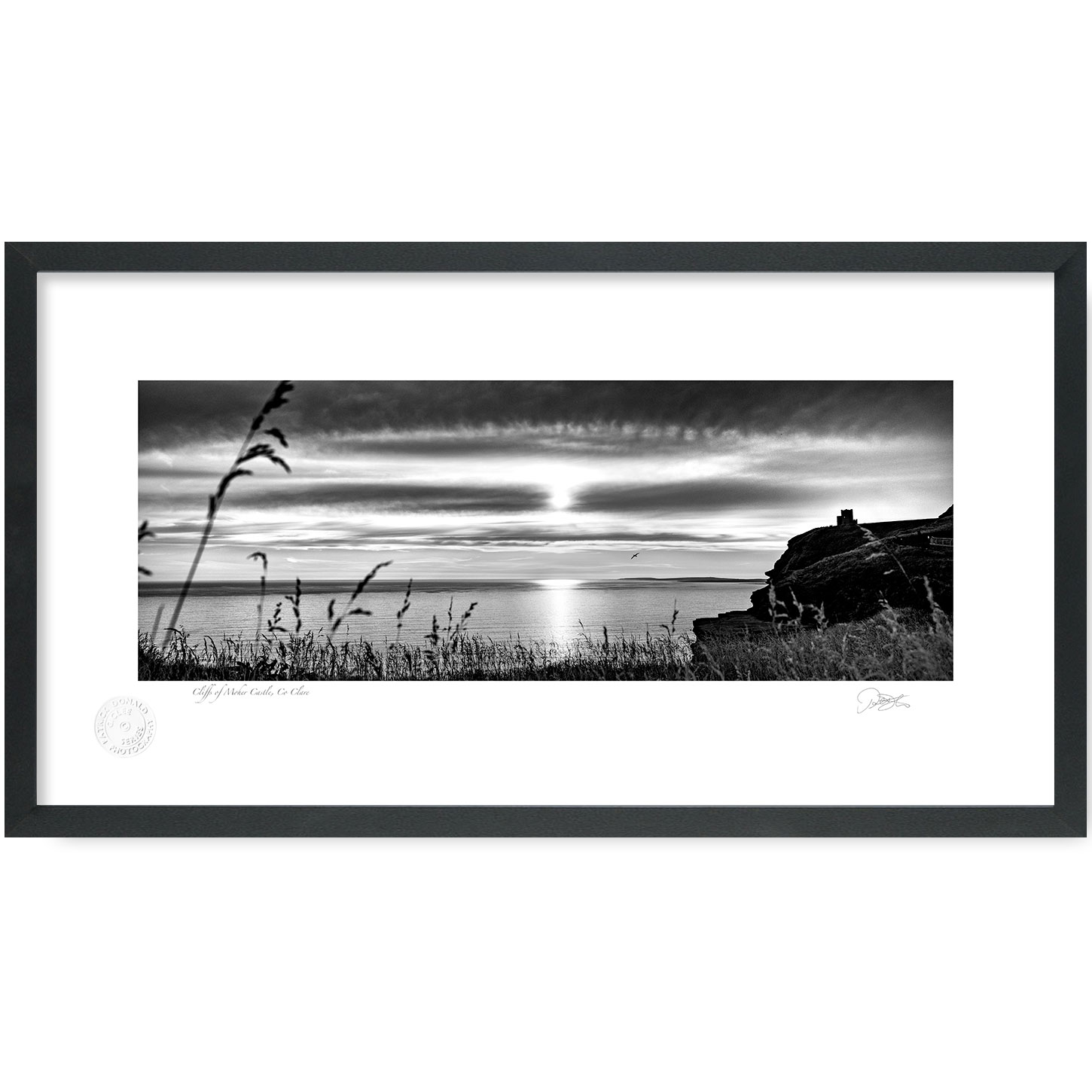 Cliffs of Moher Castle Co Clare is a Fine Art Black & White Open Edition Print by Patrick Donald. Framed Photography of Ireland is Delivered to your door from his studio in Kilkenny, Award-winning Irish Landscape & Documentary photographer who takes pride in his craft.