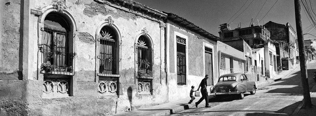A simply tranquil street scene of a father and son crossing a road in Cuba.