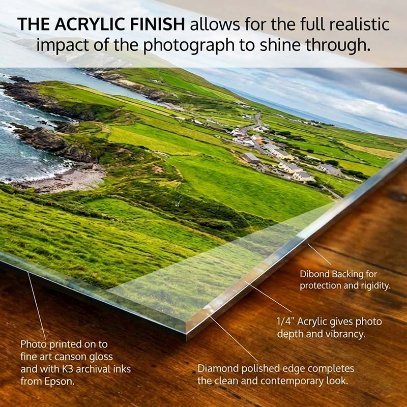 Acrylic Finish: This is a to the edge finish just as it shows in the visual, they hang on a wooden slip that is concealed at the rear of the picture. It is a great way to present particularly colour images in this contemporary way, the image really pops out to give an extra dimension of reality and aesthetic. As well as being a sturdy scratch proof high end way of finishing.