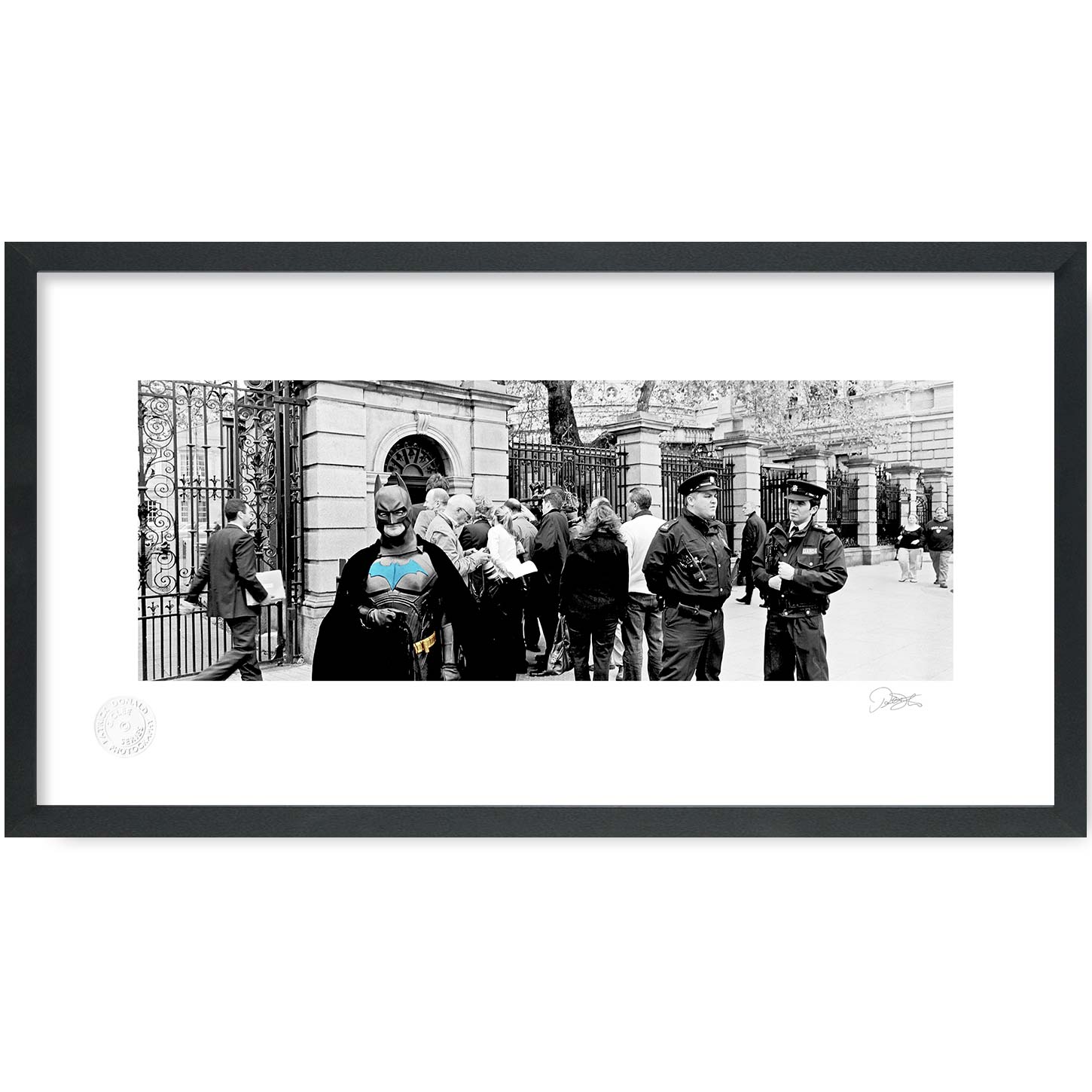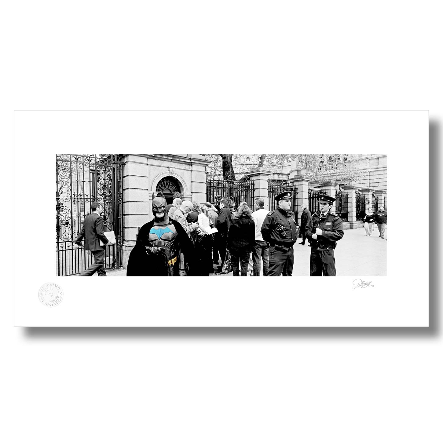 Batman outside Leinster House is a Fine Art Black & White Limited Edition Print by Patrick Donald. Photography of Ireland is Delivered to your door from his studio in Kilkenny, Award-winning Irish Documentary photographer who takes pride in his craft.