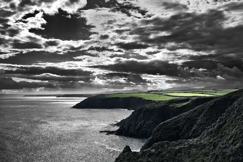 Shooting towards the light gives me generally a better range of tones in the final print, it is however a little more tricky to achieve as lens flare can render it unusable. The green colour I have held on to on the peninsula that projects out from the mainland in this B/W photo with dramatic skies.