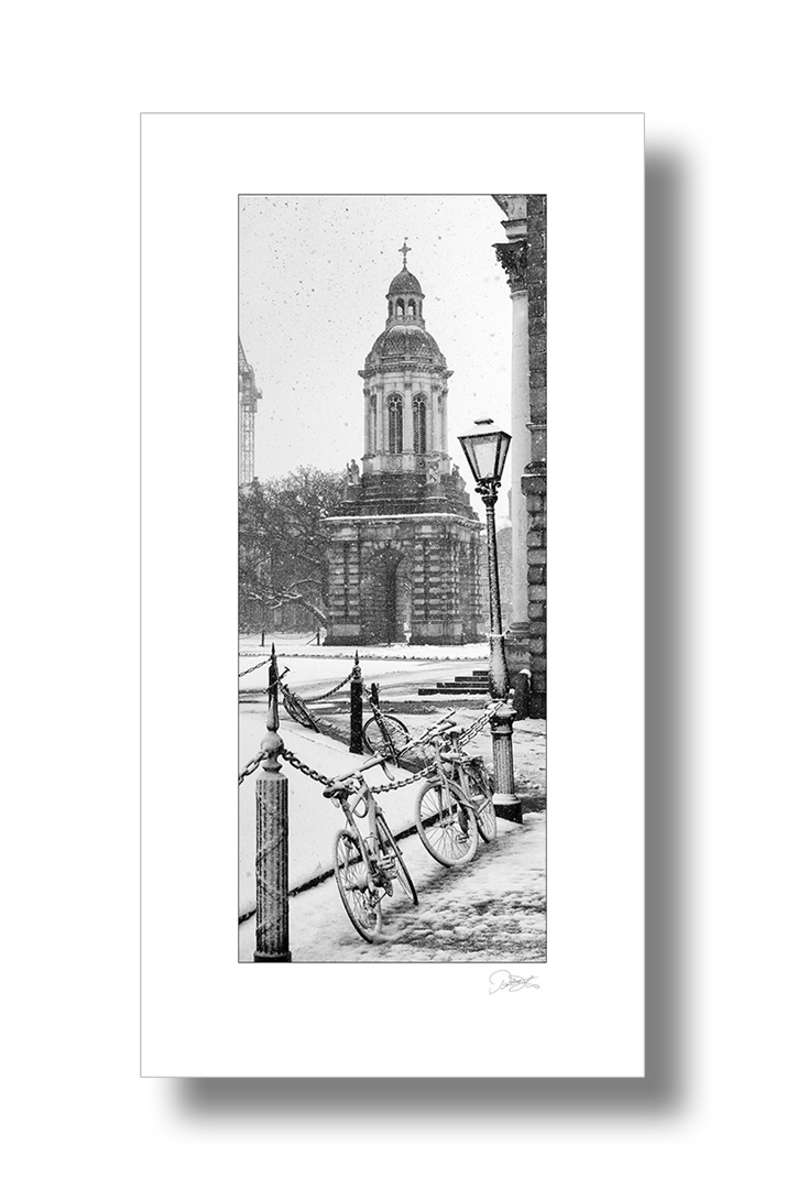 A uniquely framed composition of the Campanile in the snow on Trinity College campus is available as an original frame piece by Patrick Donald. A black and white fine art photographer.
