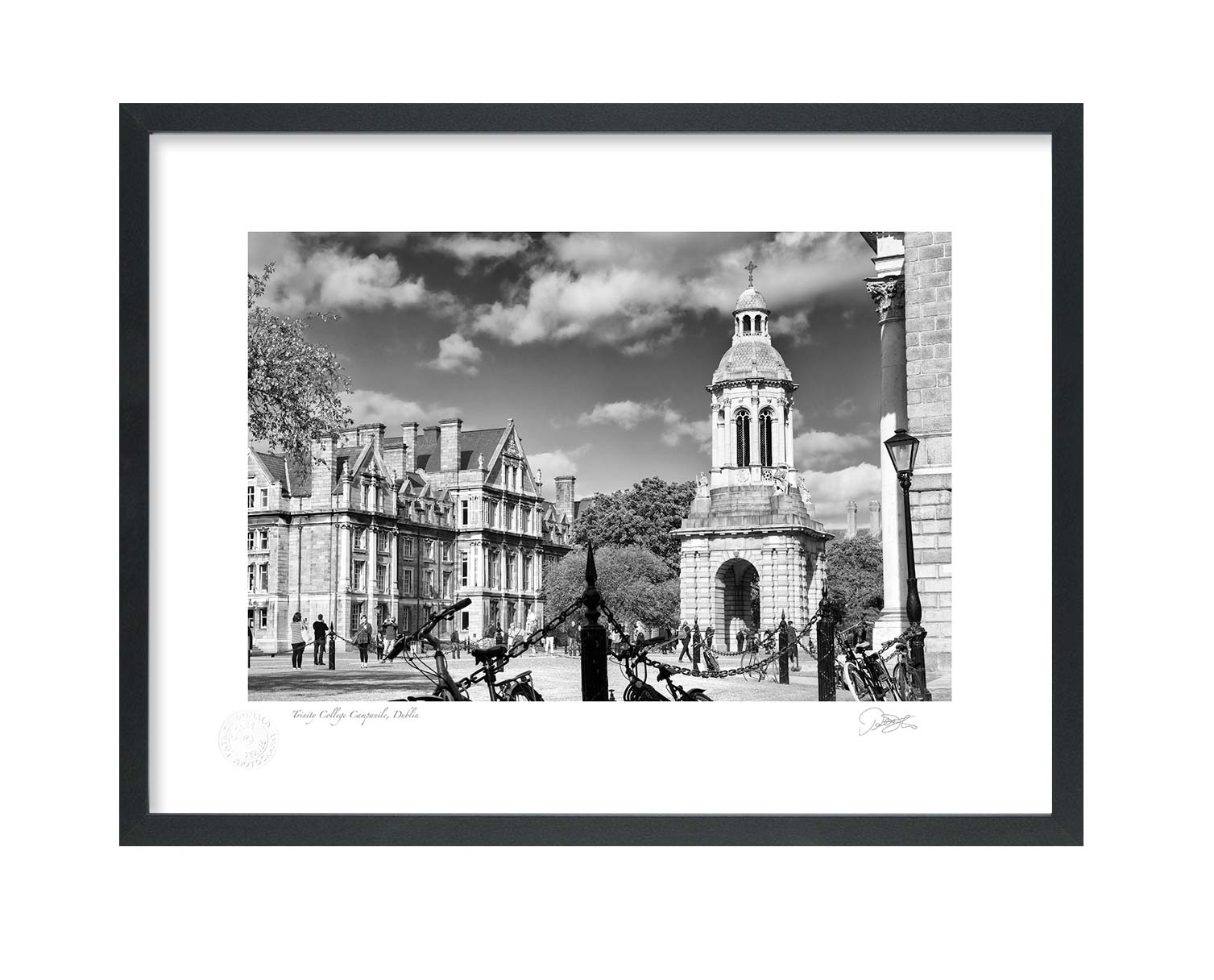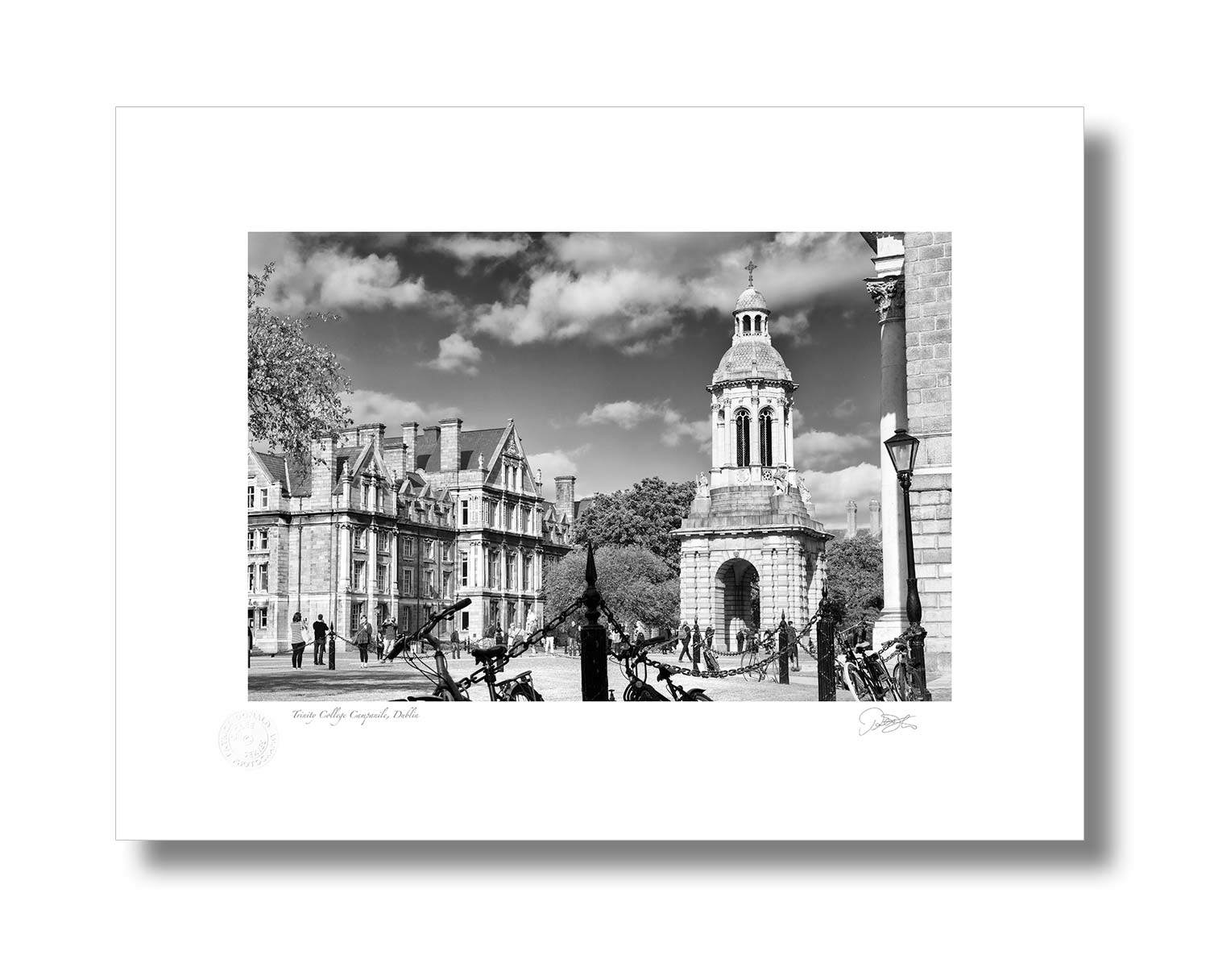 In the centre of Dublin Trinity College Dublin stands proud amongst the city shops and busy streets. The imposing Campanile in the centre of Parliament Square with the Library to the left of the frame is elegantly framed.