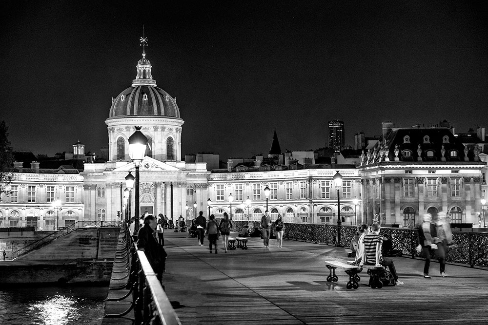 A quiet night walk on the Pont des Arts with the city lights reflecting the elegance of Paris.