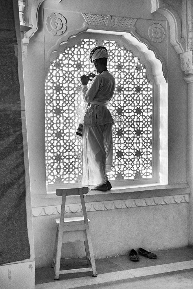 A delicate and timeless moment of an elegant worker in traditional Indian dress inside the Fort fulfilling his duties of surveillance to the outside area of Fort.