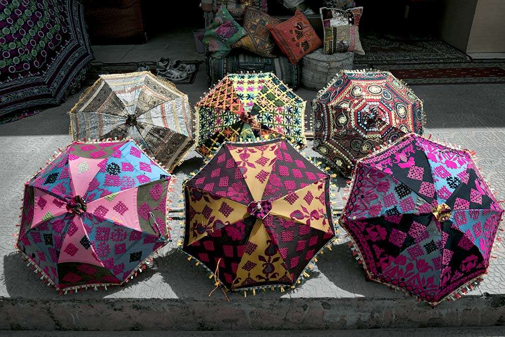 The juxtaposition of the sunshine beating down on the umbrellas took my attention during a photographic walk through the streets of a Rajasthan village.